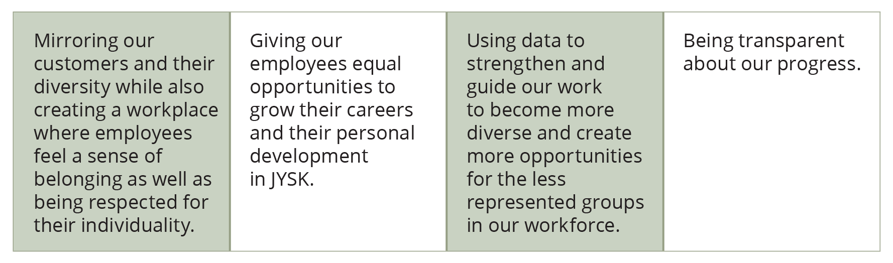 DEI is more than just words for us – it is ingrained in our JYSK Values, which every employee commits to. These principles guide how we build our teams and develop our leaders. We believe that a rich mix of minds, talents, and unique personalities makes us stronger as a team.